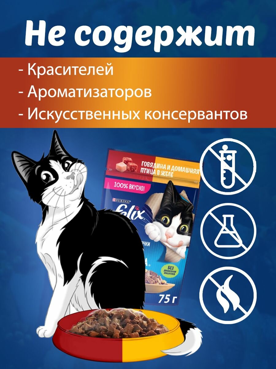 Влажный корм для кошек Felix Аппетитные кусочки в желе с говядиной и домашней птицей 26шт.*75г интересное: