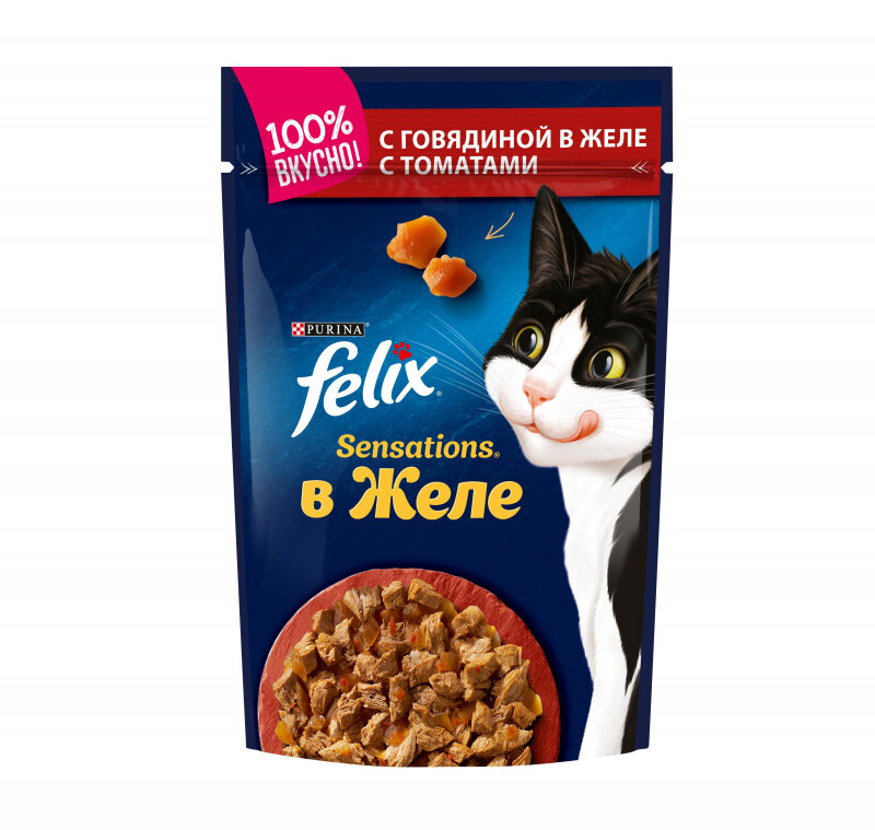 Купить Felix Паучи Sensations кусочки в желе для кошек с говядиной и томатами (12232833123189651244963712493529) | Sensations 0,085 кг 24142 (26 шт)