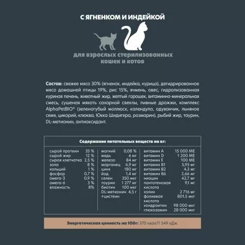 ALPHAPET SUPERPREMIUM Сухой корм для взрослых стерилизованных кошек с Ягненков и Индейкой