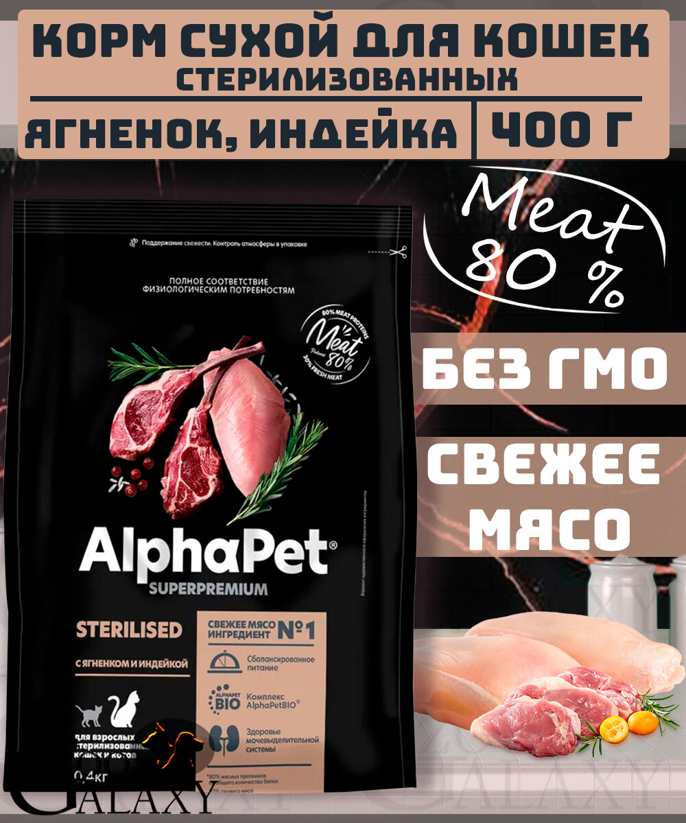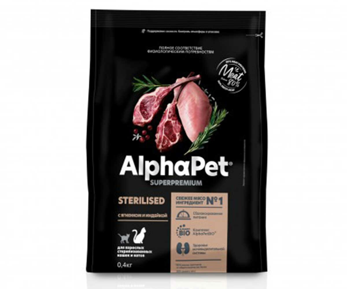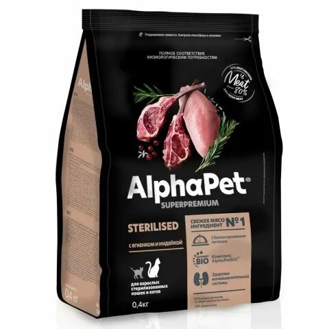 Корм сухой для стерилизованных кошек AlphaPet с ягненком и индейкой, пак. 0,4кг