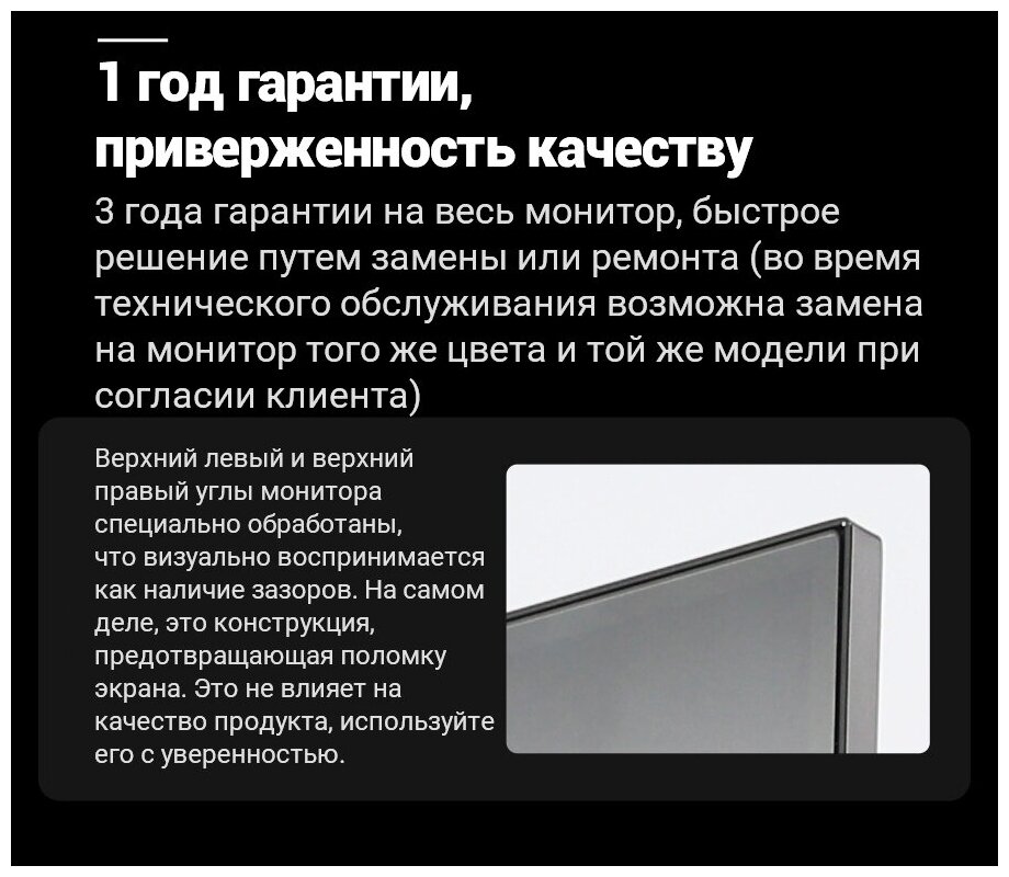 | Отзыв: | это наверное 5 попытка покупки игрового монитора. до этого покупал разные мониторы от 16-23 т. р. перепробовал все матрицы, почти во всех ips был с засветами, va матрицы мерцали при включении freesync и света очень едкие, у tn были косяки с подсветкой (затемнения по углам). в общем уже потерял надежду купить хороший монитор. и тут наткнулся на это чудо. ну вот прям все хорошо, ни засветов ни мерцания, никаких битых пикселей. вот только не выходит из сна, в интернете пишут у многих такая проблема на разных мониторах и проблема кроется в кабеле, но увы не проверял. монитор однозначно рекомендую. за такой ценник вы получаете качество и красоту.