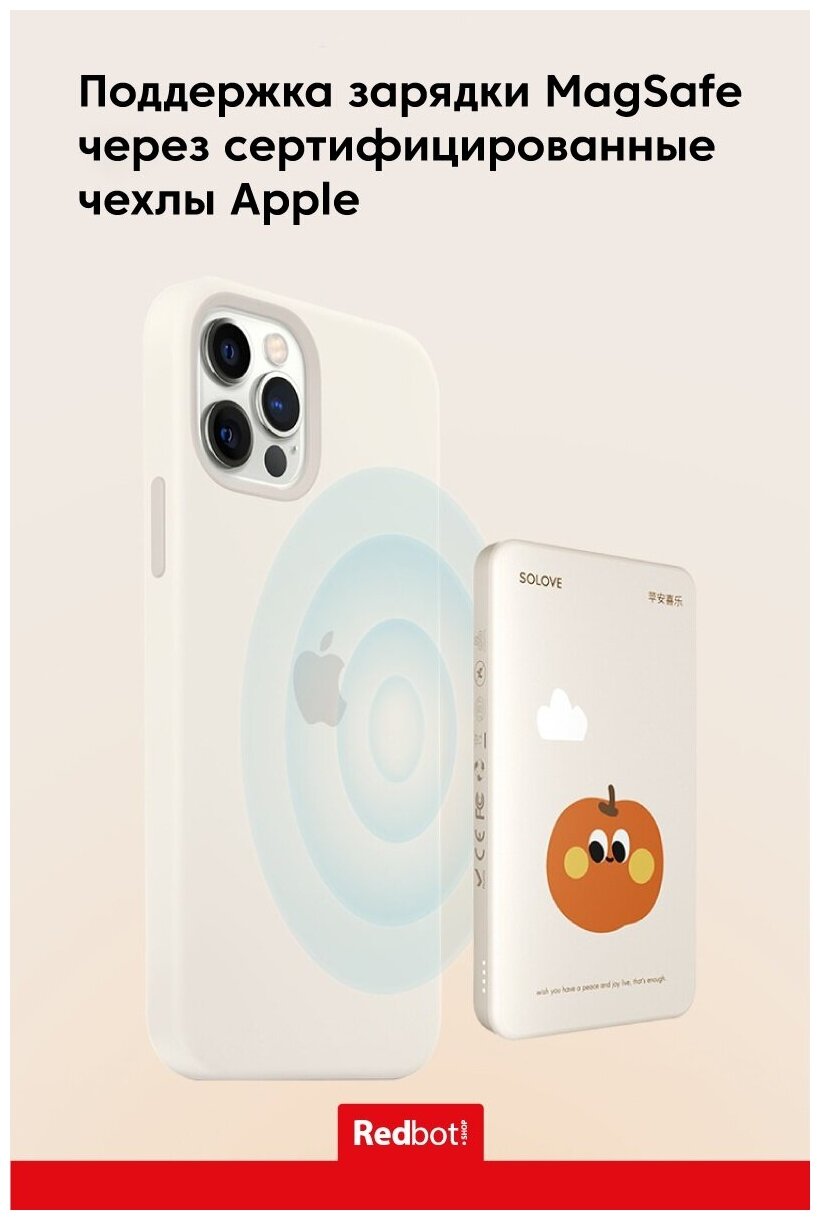 Внешний аккумулятор Power Bank SOLOVE 5000mAh Magnetic MagSafe 20W QC 3.0 PD 3A Lightning input *1 + Type-C input/output dual side *1 (W9 Beige Apple) c рисунком яблок