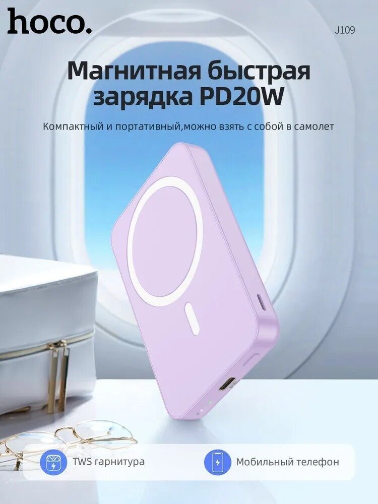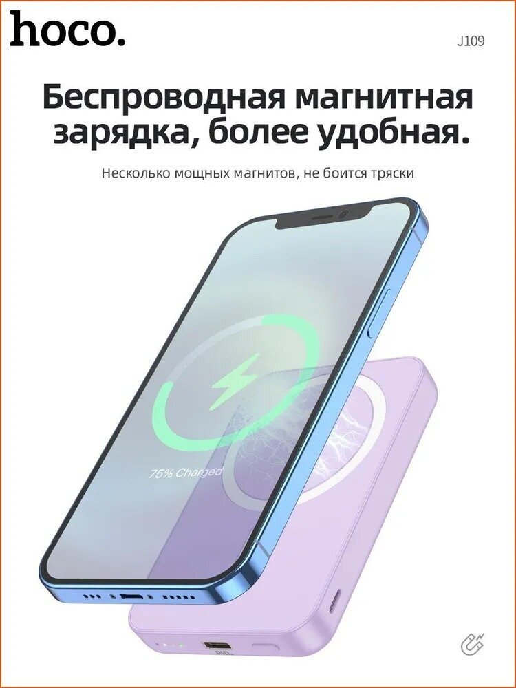 Беспроводной магнитный аккумулятор Hoco J109 Magnetic Charger, 5000 mAh, Qi15W/PD20W, Purple