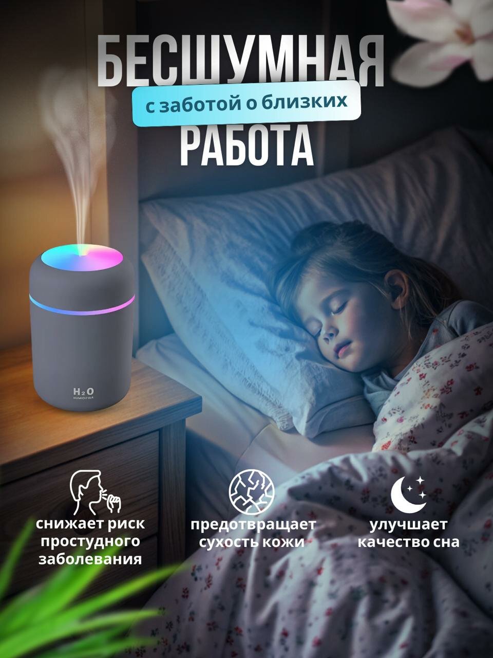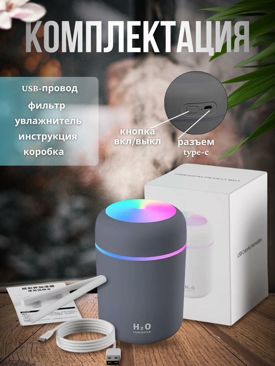 Увлажнитель воздуха H2O / Аромадиффузор ночник / Ультразвуковой освежитель с подсветкой серый интересное: