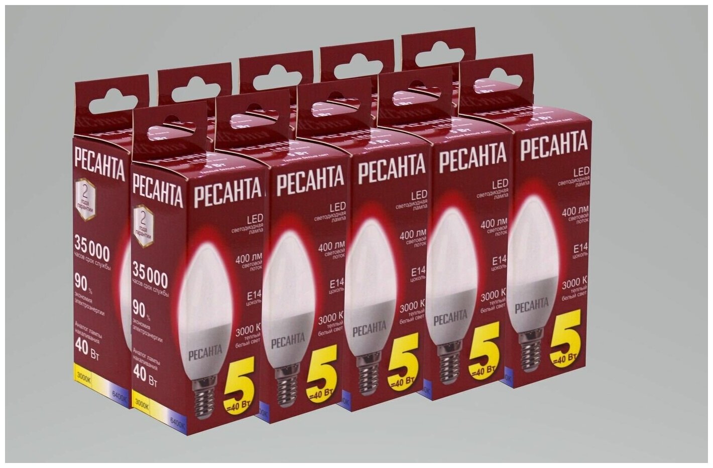 Лампа светодиодная (10шт) свеча, 5Вт, теплый, Е14 Ресанта LL-R-C37-5W-230-3K-E14 интересное: