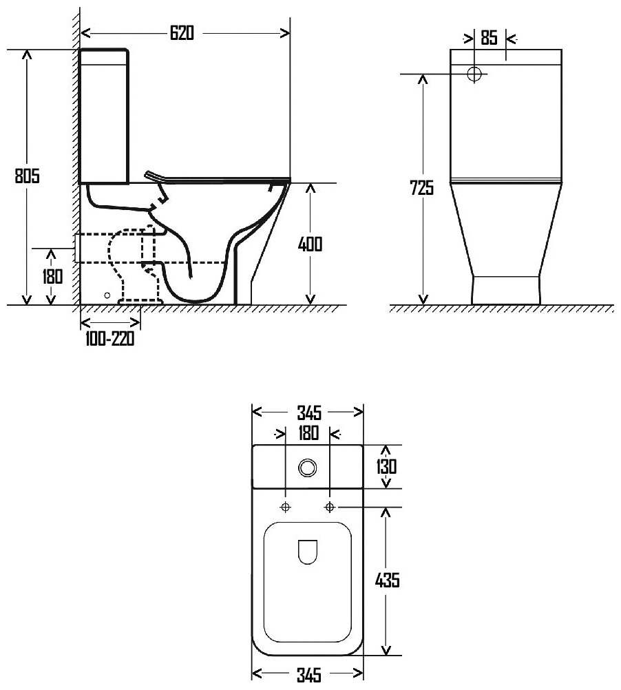 AQM1005 Унитаз напольный Rimless c сиденьем SoftClose, горизонтальный выпуск. 620x345x415мм
