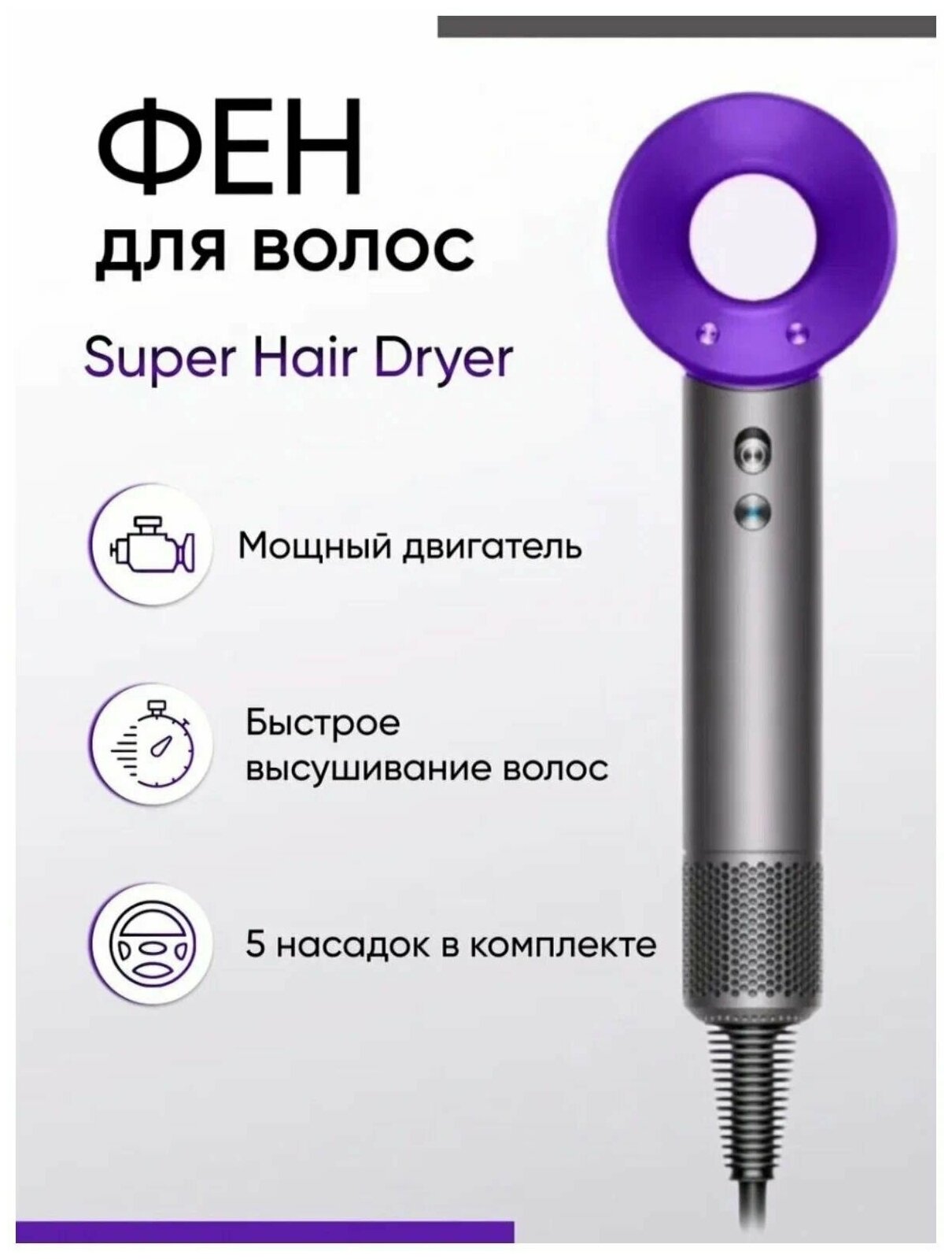 Фен для волос Super hair Dryer/Набор для укладки/ Мультистайлер/стайлер с насадками 5в1 (фиолетовый) интересное: