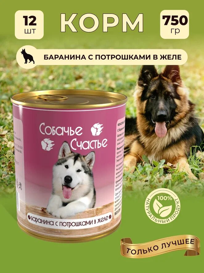 Собачье счастье консервированный корм для собак Баранина с потрошками в желе 750г