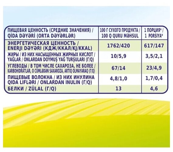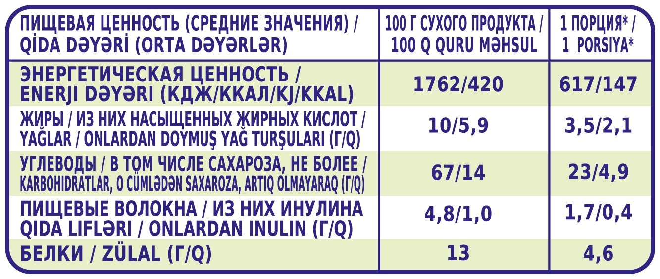 | Состав | пшеничная мука, сухое цельное молоко, сахар, концентрированный яблочный сок, банановое пюре, инулин, карбонат кальция, витаминно-минеральный премикс (тиамина мононитрат, рибофлавин, пиридоксина гидрохлорид, L-аскорбиновая кислота, DL-α-токоферола ацетат, ретинол ацетат, холекальциферол, никотинамид, фолиевая кислота, D-биотин, кальция-D-пантотенат, цианокобаламин, филохинон, железа (II) фумарат, оксид цинка, йодид калия). Содержит глютен |