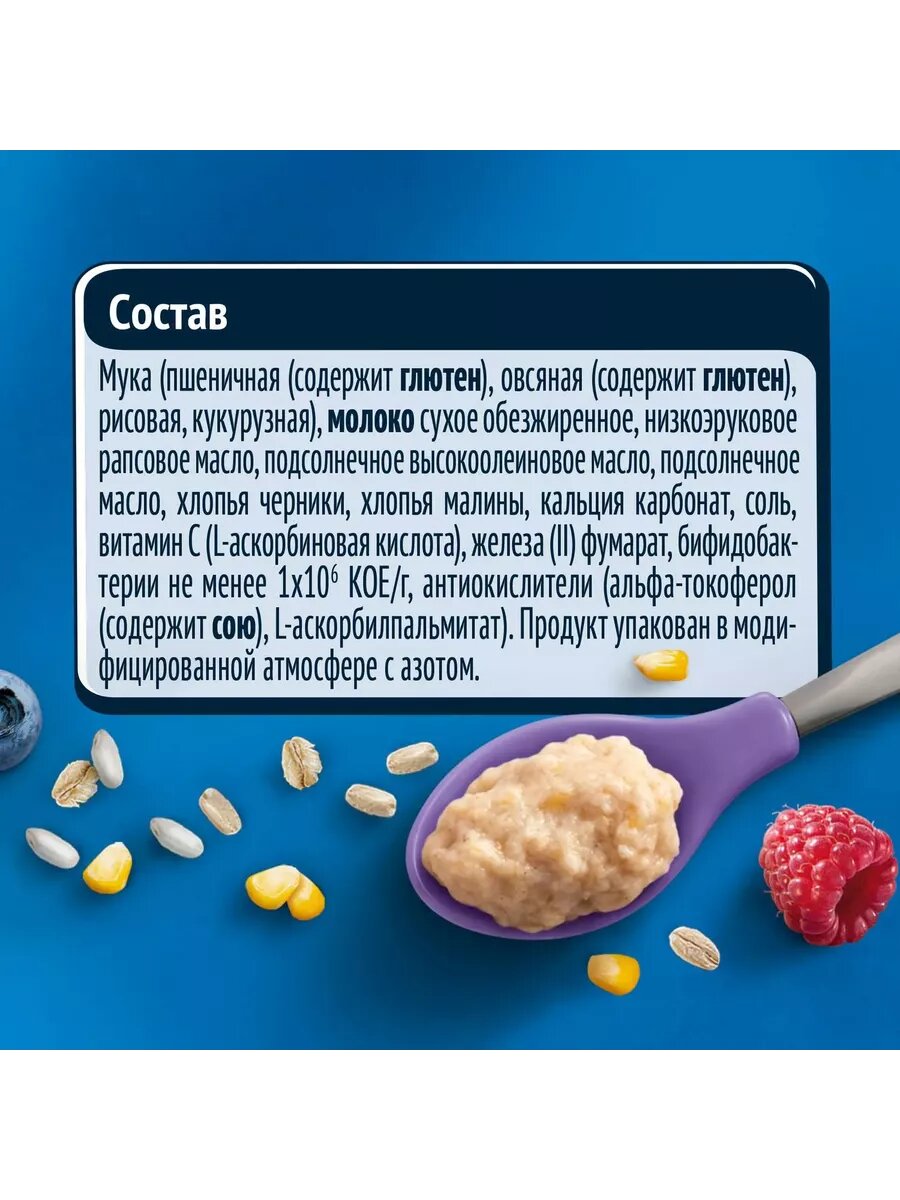 | Состав | мука пшеничная (57,2%),овсяная (7,9%), рисовая (2%), кукурузная (2%), молоко сухое обезжиренное (16,6%), смесь растительных масел (низкоэруковое рапсовое, подсолнечное высокоолеиновое, подсолнечное), антиокислители (L-аскорбилпальмитат, альфа-токоферол, лимонная кислота), хлопья черники (2%), хлопья малины (2%), минеральные вещества (кальция карбонат, железа(II) фумарат), бифидобактерии не менее 1х10^6 КОЕ/г |