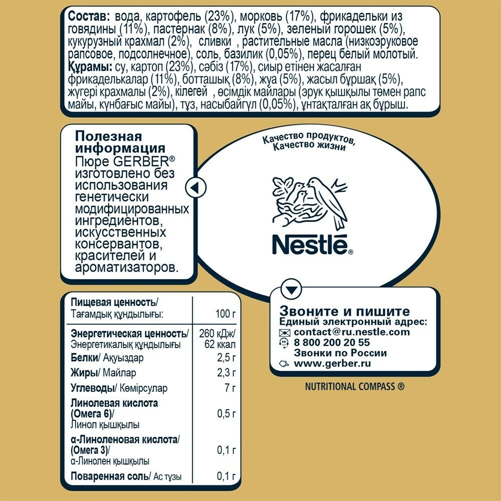 | Минусы: | Покупала пюре мясное с овощами с 12 месяцев.. я перед этим попробовала..в нем очень много перца..не вкусно.. дала попробовать ребенку.. выплюнул)) выбросила пюре)) кое как другое поел, но Гербер больше покупать не буду.. если только овощи |