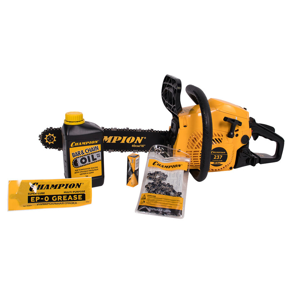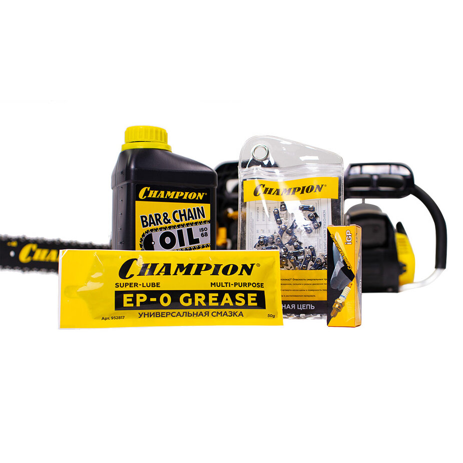 | Комплект поставки | бензопила, направляющая шина, цепь пильная, свечной ключ, отвертка для настройки карбюратора, масло для смазки пильных цепей и шин champion 1 л, присадка к топливу champion (0.1 л), цепь champion 3/8"-1.3 мм-56 зв., руководство по эксплуатации |