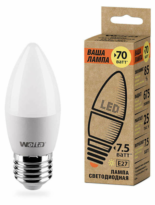 Лампа Wolta свеча 7.5 Вт LED, 3000K, 25YC7.5E27 интересное: