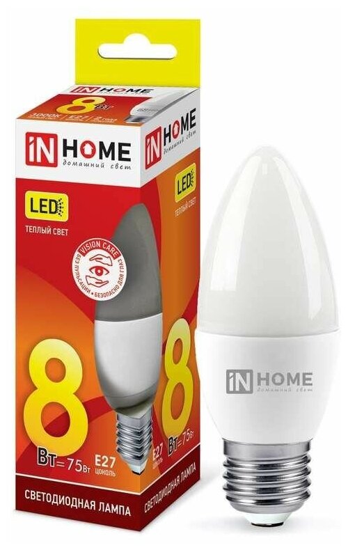 Лампа светодиодная LED-СВЕЧА-VC 8Вт 230В Е27 3000К 760 Лм IN HOME интересное: