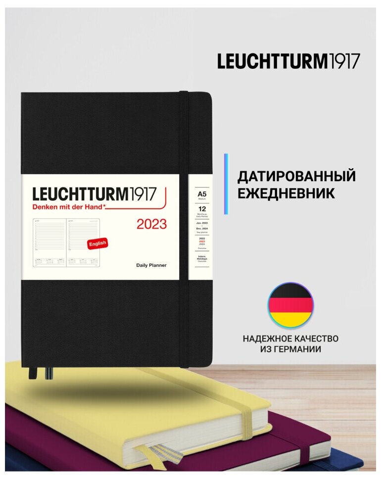 Ежедневник-планер Leuchtturm1917 Medium A5 (14.5x21см.) датированный на 2023 год, 80г/м2 - 464стр., твердая обложка, цвет: черный интересное: