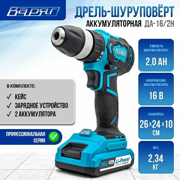 Аккумуляторная бесщеточная дрель-шуруповерт Варяг ДА-16/2Н + подарок бита WirlPower PH2 Original, 50мм