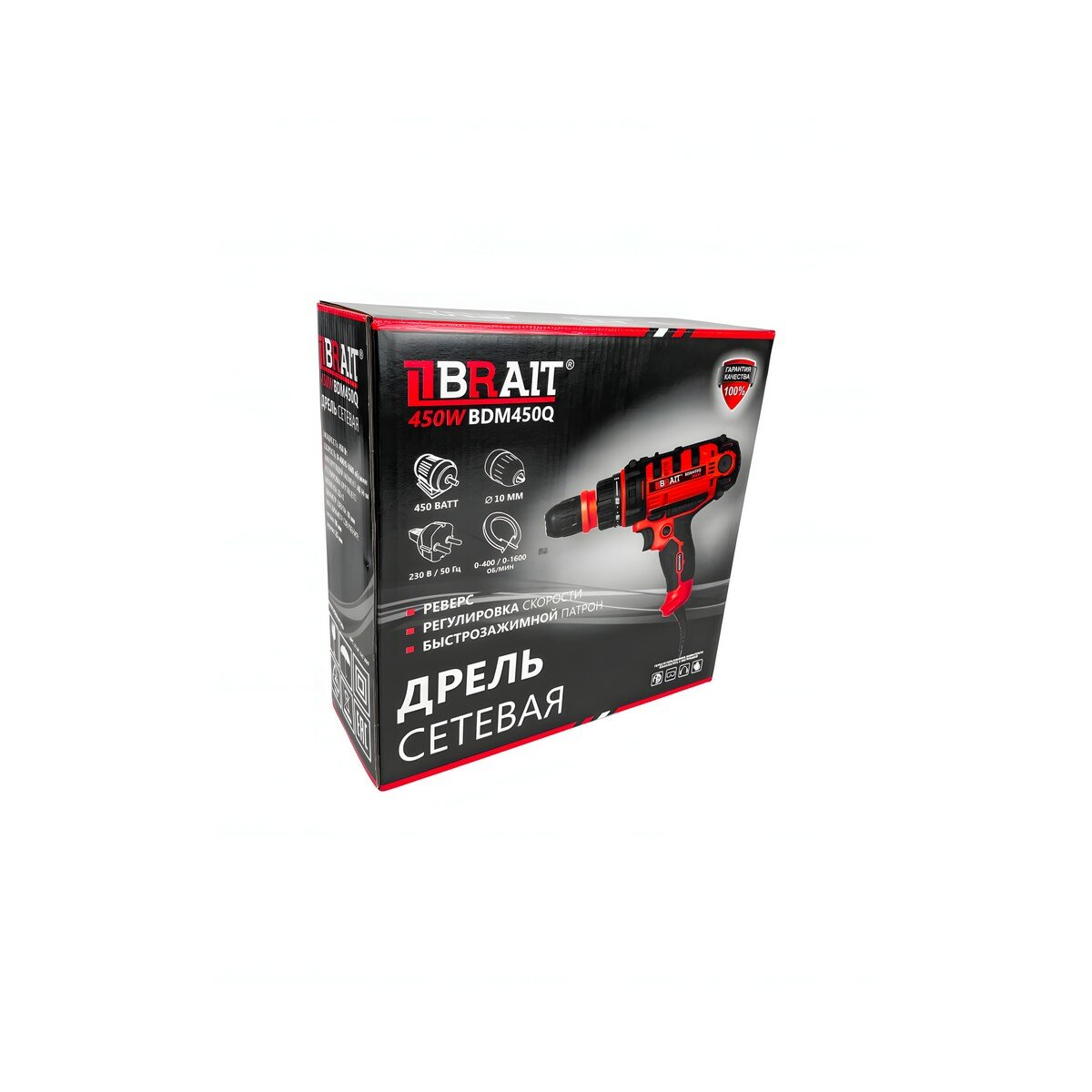 Дрель сетевая BRAIT BDM450Q, 450Вт, 10мм быстрозажимной патрон, регулировка ск., реверс, картон
