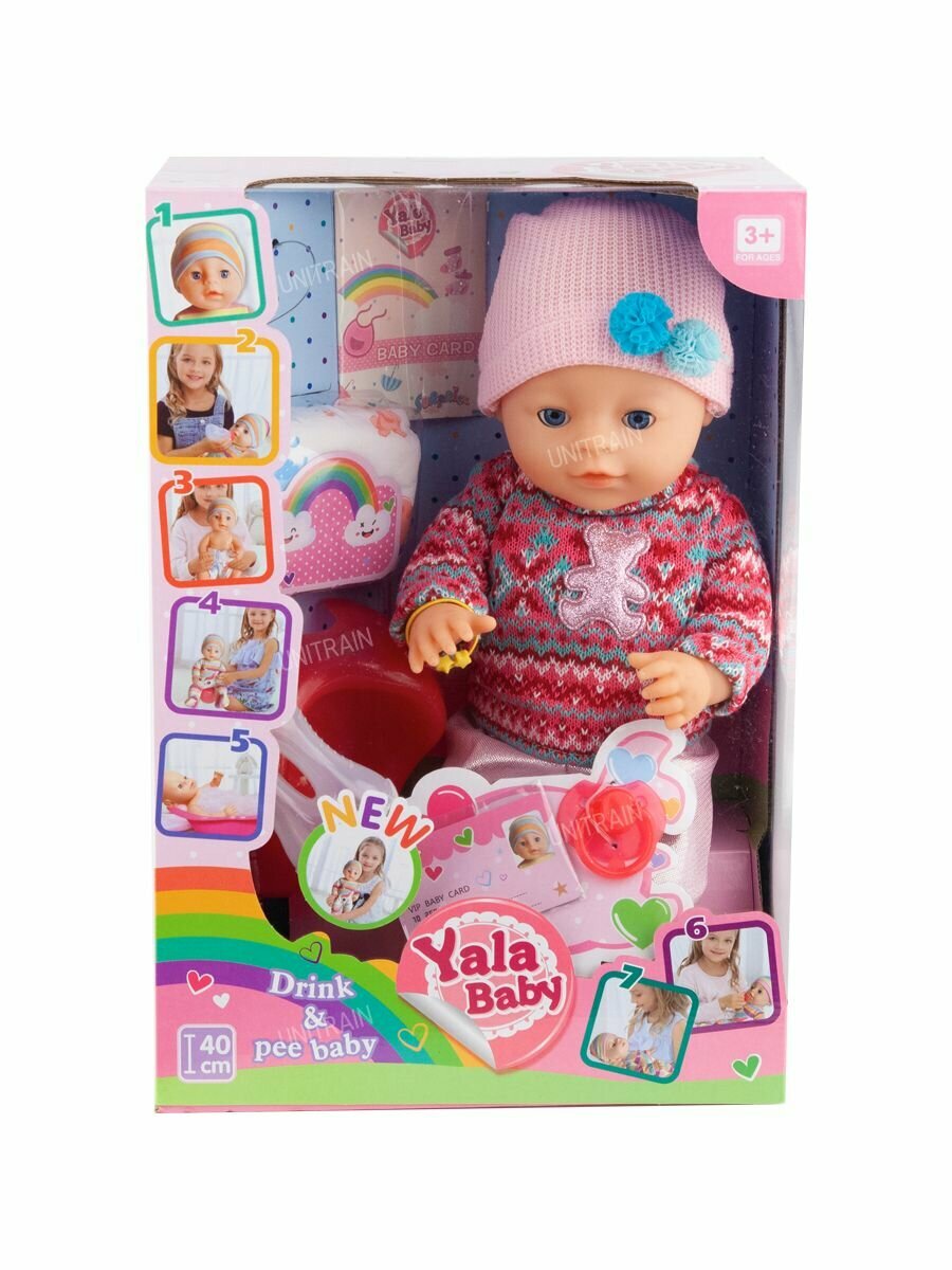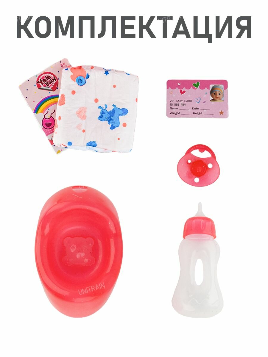 | Комплектация | пупс, пустышка (во рту не фиксируется, выполняет роль аксессуара), а также бутылочка для кормления, горшок, подгузник (1шт.), свидетельство о рождении (1шт.), карточка куклы (1шт.), браслет (1шт.). |