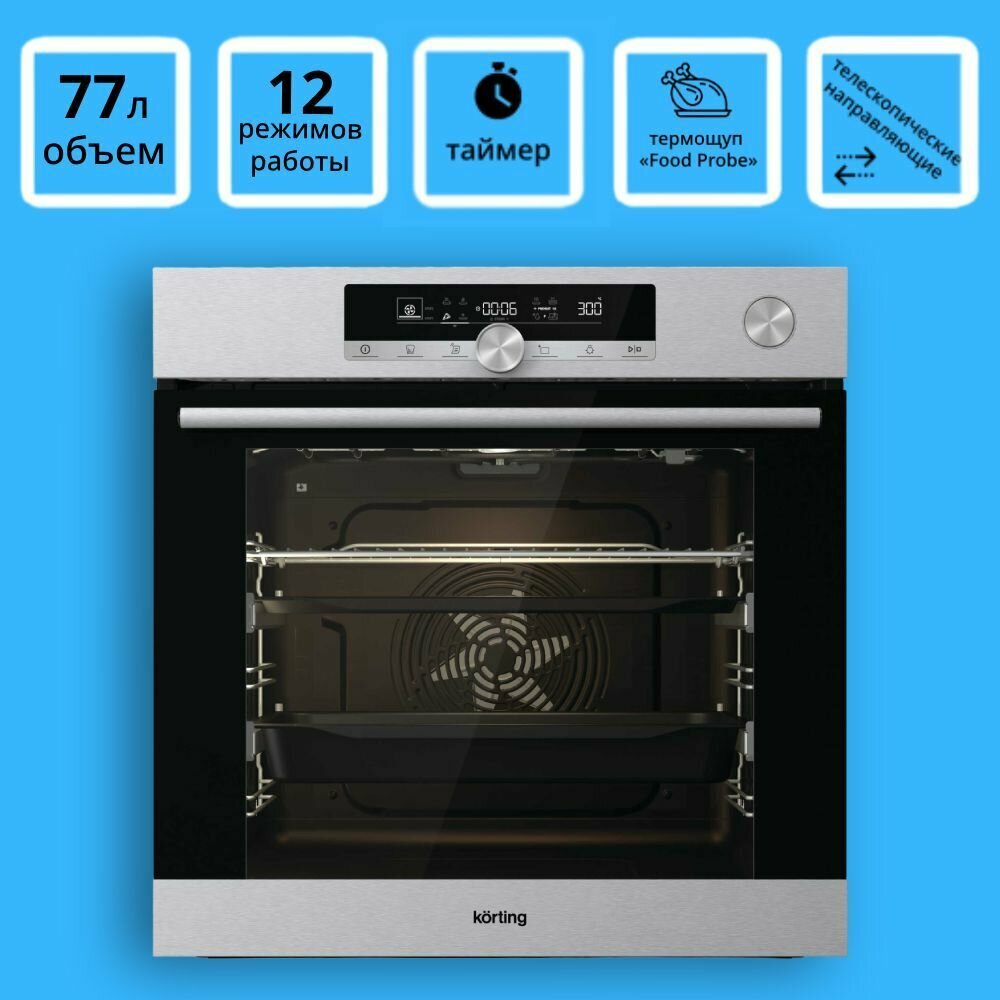 Встраиваемая газовая духовка Korting Встраиваемый 60 см, Motion, 77 л, 12 режимов, очистка паром, нерж. сталь
