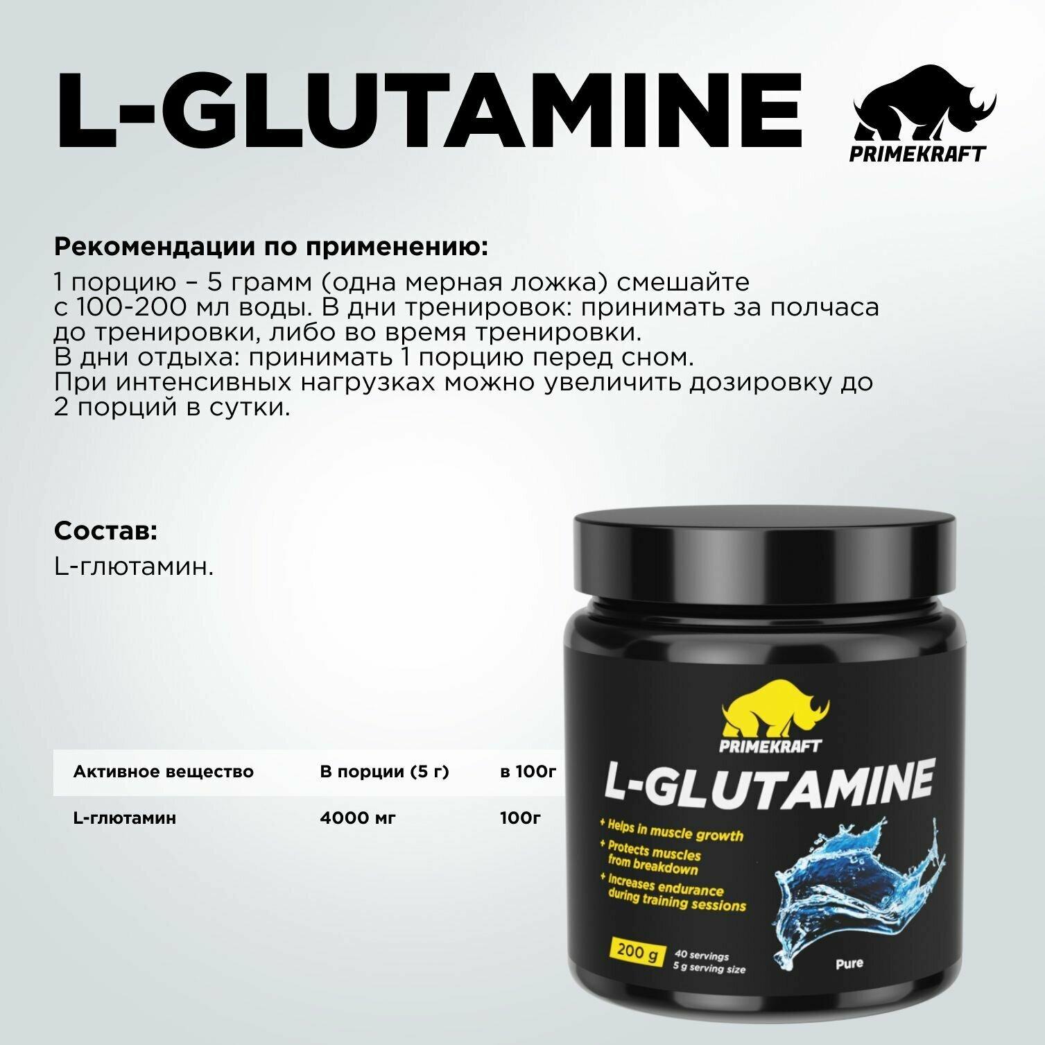Аминокислоты PRIMEKRAFT Глютамин L-Glutamine Чистый, без вкуса 200 г / 40 порций