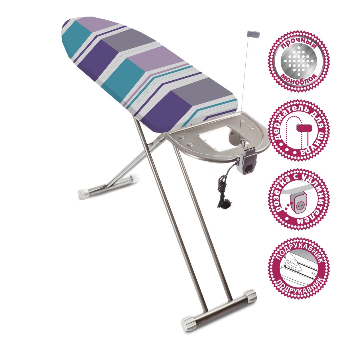 Доска гладильная Мастерица IB-0108, 38*120см, материал: сталь, хлопок, поролон; столешница: метал. моноблок; розетка с удлинит, подрукавник интересное: