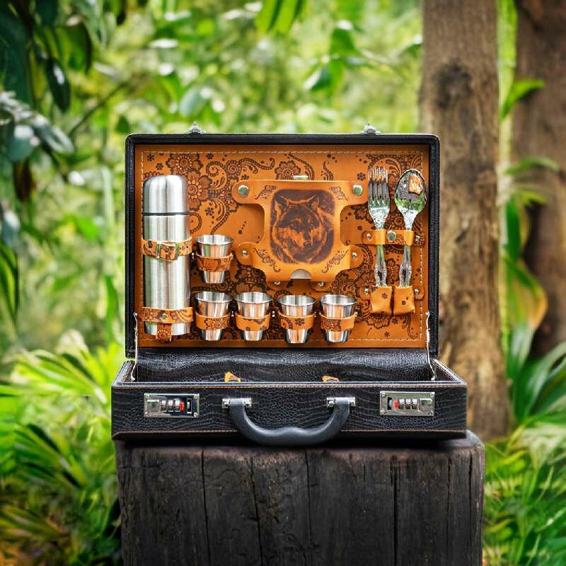 | Комплектация | По 5шт:Вилки,ложки,стопки,тарелки. Фляга,термос 0,33,нож с дер ручкой+складной нож,зажигалка,шампуры+мангал |