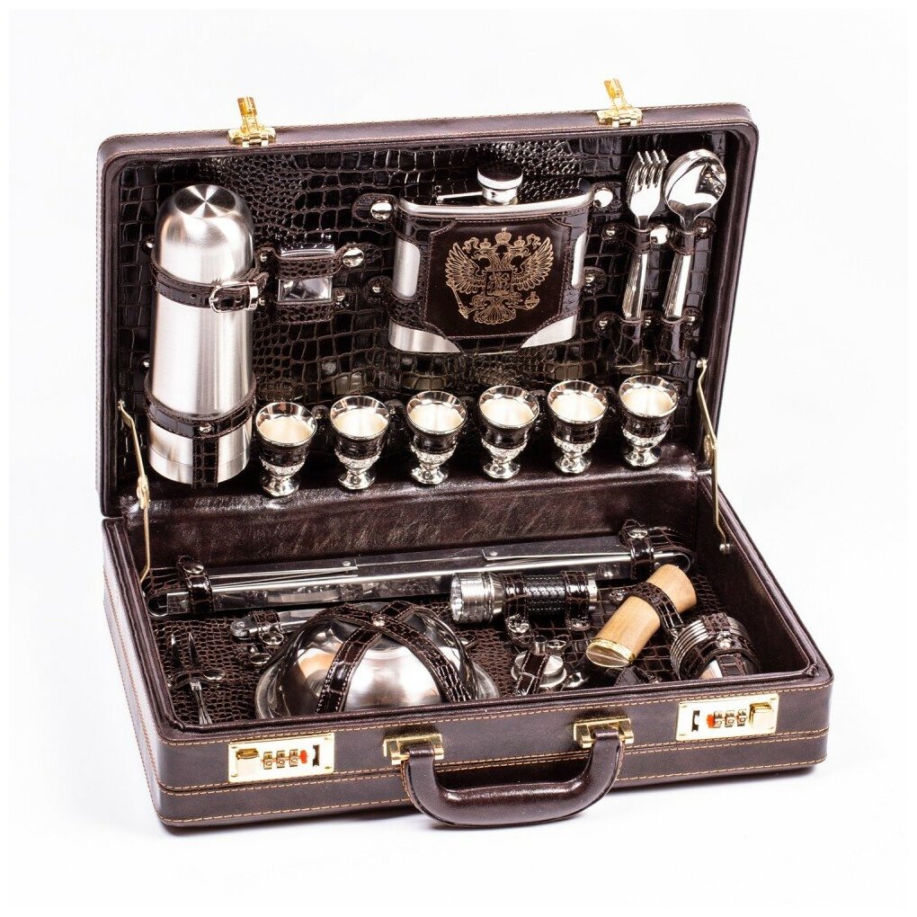 | Комплектация | 1. Кейс из кожзаменителя с внутренней отделкой из натуральной кожи и росписью ручной работы 1шт. 2. Термос из нержавеющей стали 0,35 л 1шт. 3. Фляжка из нержавеющей стали 0,5 л 1шт. 4. Вилки из нержавеющей стали 6шт. 5. Ложки из нержавеющей стали 6шт. 6. Рюмки из стали с никель-серебрянным покрытием 6шт. 7. Мангал складной из нержавеющей стали 1шт. 8. Шампура из нержавеющей стали 6шт. 9. Нож охотничий из нержавеющей стали и рукоятью из ореха и латуни 1шт. 10. Тарелки из нержавеющей стали 6шт. 11. Стаканы из нержавеющей стали 6шт. 12. Воронка из нержавеющей стали для заполнения фляжки 1шт. 13. Штопор сомелье 1шт. 14. Вилка из нержавеющей стали для мяса 1шт. 15. Чехол для кейса из высокопрочного прозрачного пластика предназначенный для защиты от влаги и сохранения товарного вида 1шт. 16. Нож складной перочинный многофункциональный 1шт. |