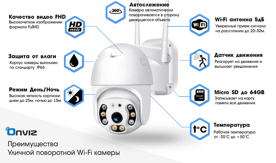 СохранитьКупольная поворотная Wi-Fi камера видеонаблюдения Onviz U70 беспроводная 2 Мп / уличная камера / наружная / для дома / для дачи интересное: