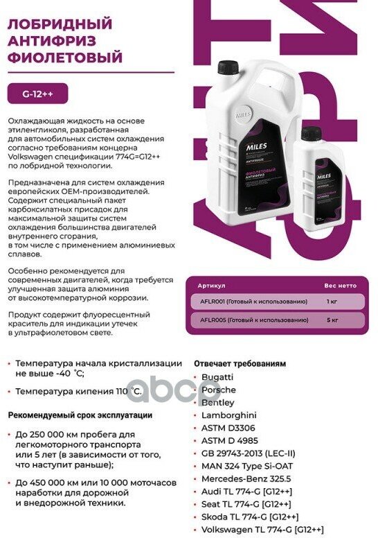 MILES AFLR005 Антифриз MILES фиолетовый G12++ готовый 5 кг