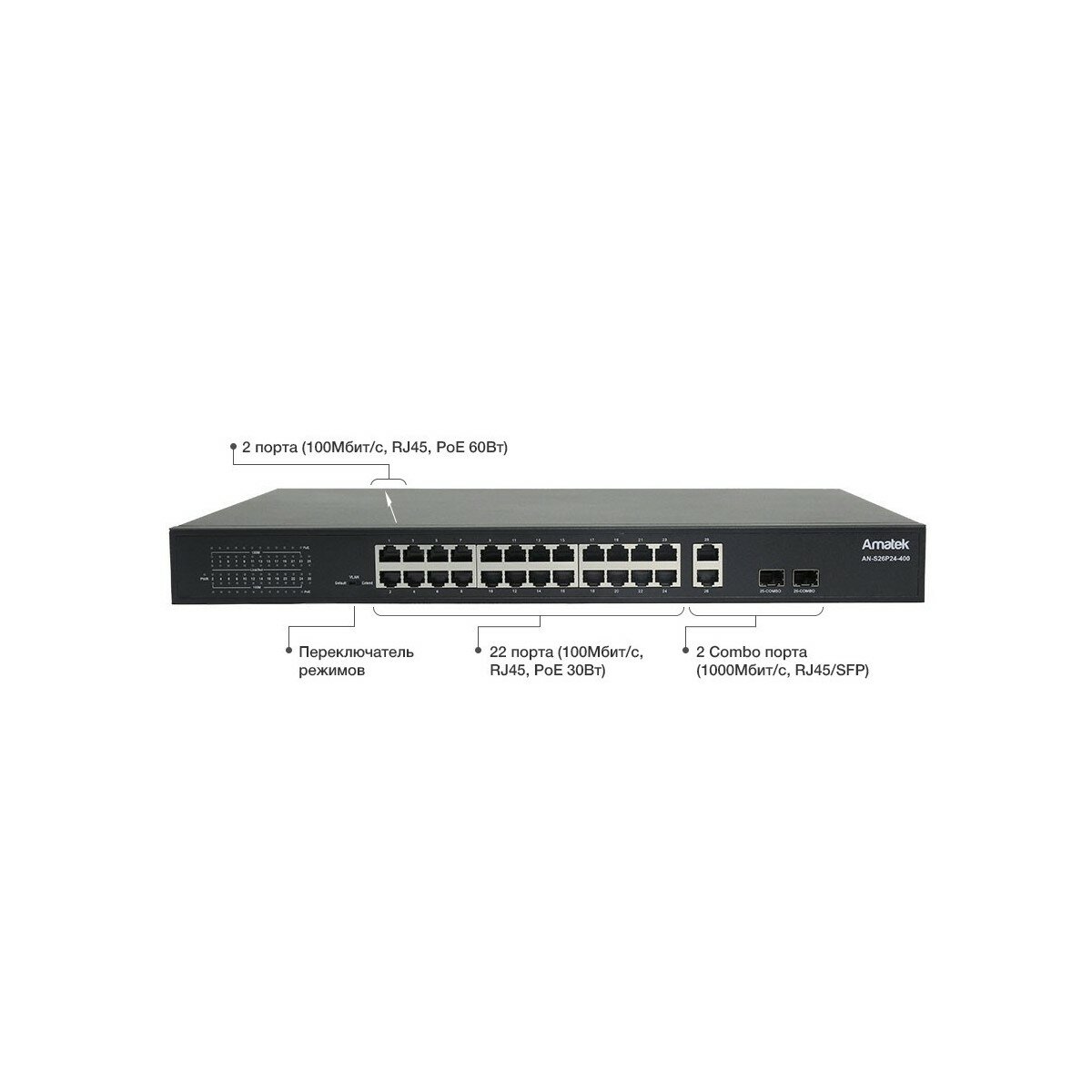 AN-S26P24-400 c HiPoE Amatek 26-портовый 100/1000 Мбит/с коммутатор с HiPoE/PoE+ до 400Вт интересное: