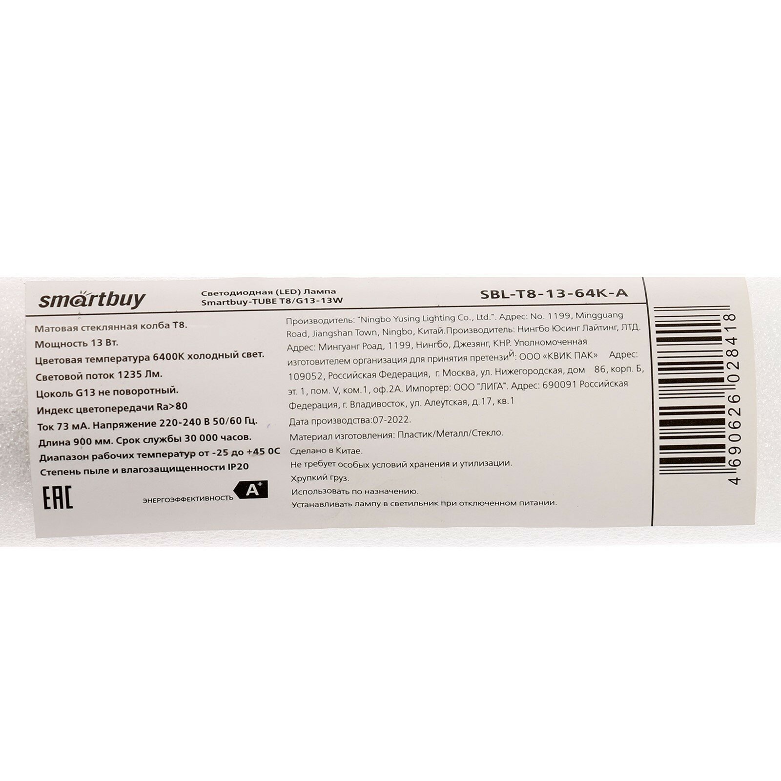 Купить Лампа cветодиодная Smartbuy TUBE, Т8, G13, 13 Вт, 6400 К, 1235 Лм, 900 мм, холодный белый
