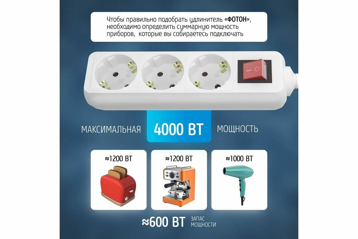 Удлинитель фотон 16-23ЕS, 3 розетки, с/з, 16А / 4000 Вт белый 2 м 3