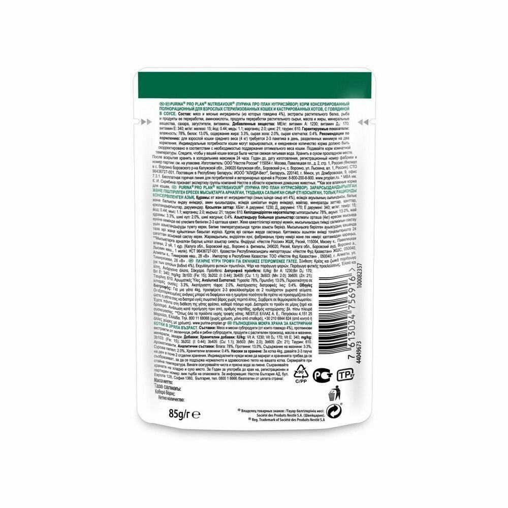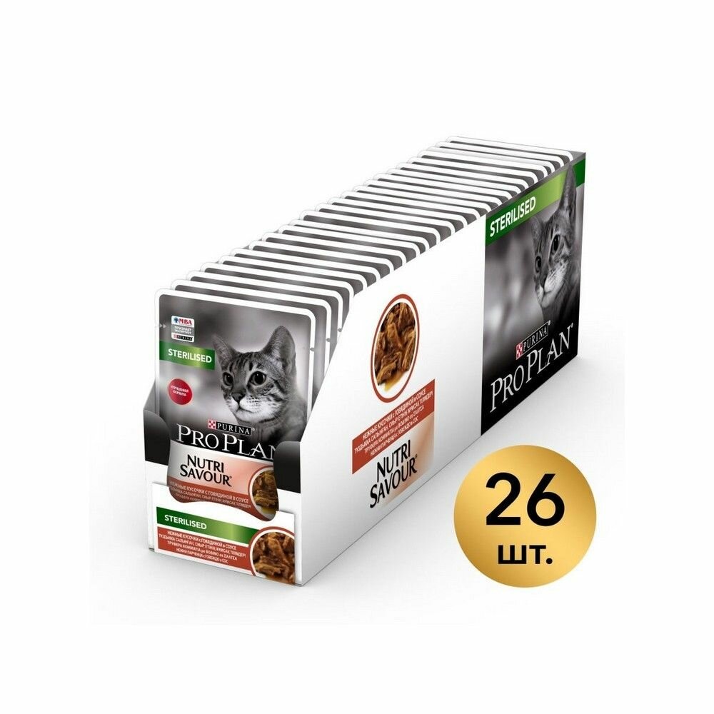 Pro Plan Nutrisavour Sterilised пауч для стерилизованных кошек и котов (кусочки в соусе) Говядина, 85 г. упаковка 26 шт