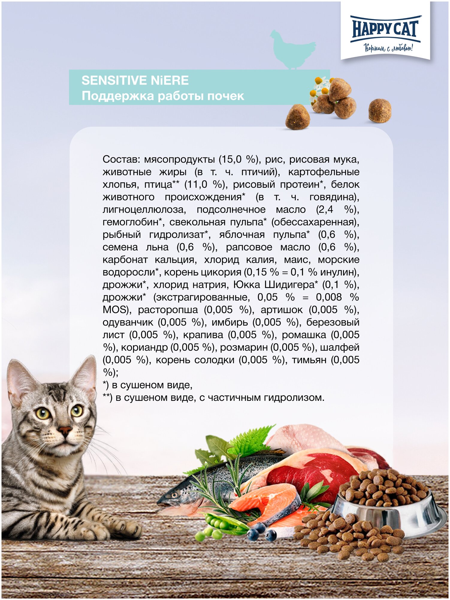| Состав | мясопродукты (15,0 %), рис, рисовая мука, животные жиры (в т. ч. птичий), картофельные хлопья, птица** (11,0 %), рисовый протеин*, белок животного происхождения* (в т. ч. говядина), лигноцеллюлоза, подсолнечное масло (2,4 %), гемоглобин*, свекольная пульпа* (обессахаренная), рыбный гидролизат*, яблочная пульпа* (0,6 %), семена льна (0,6 %), рапсовое масло (0,6 %), карбонат кальция, хлорид калия, маис, морские водоросли*, корень цикория (0,15 % = 0,1 % инулин), дрожжи*, хлорид натрия, Юкка Шидигера* (0,1 %), дрожжи* (экстрагированные, 0,05 % = 0,008 % MOS), расторопша (0,005 %), артишок (0,005 %), одуванчик (0,005 %), имбирь (0,005 %), березовый лист (0,005 %), крапива (0,005 %), ромашка (0,005 %), кориандр (0,005 %), розмарин (0,005 %), шалфей (0,005 %), корень солодки (0,005 %), тимьян (0,005 %); *) в сушеном виде, **) в сушеном виде, с частичным гидролизом. |