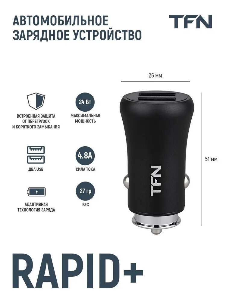 Автомобильное зарядное устройство TFN Rapid+ 2xUSB 4.8A 24W Black интересное: