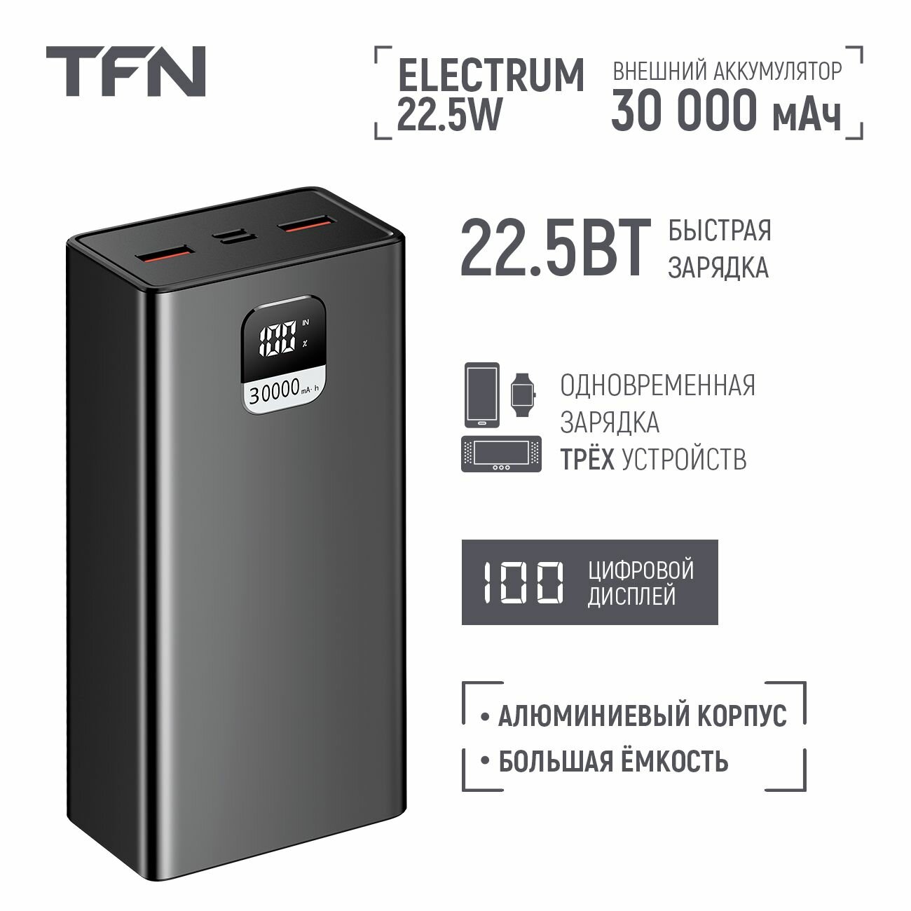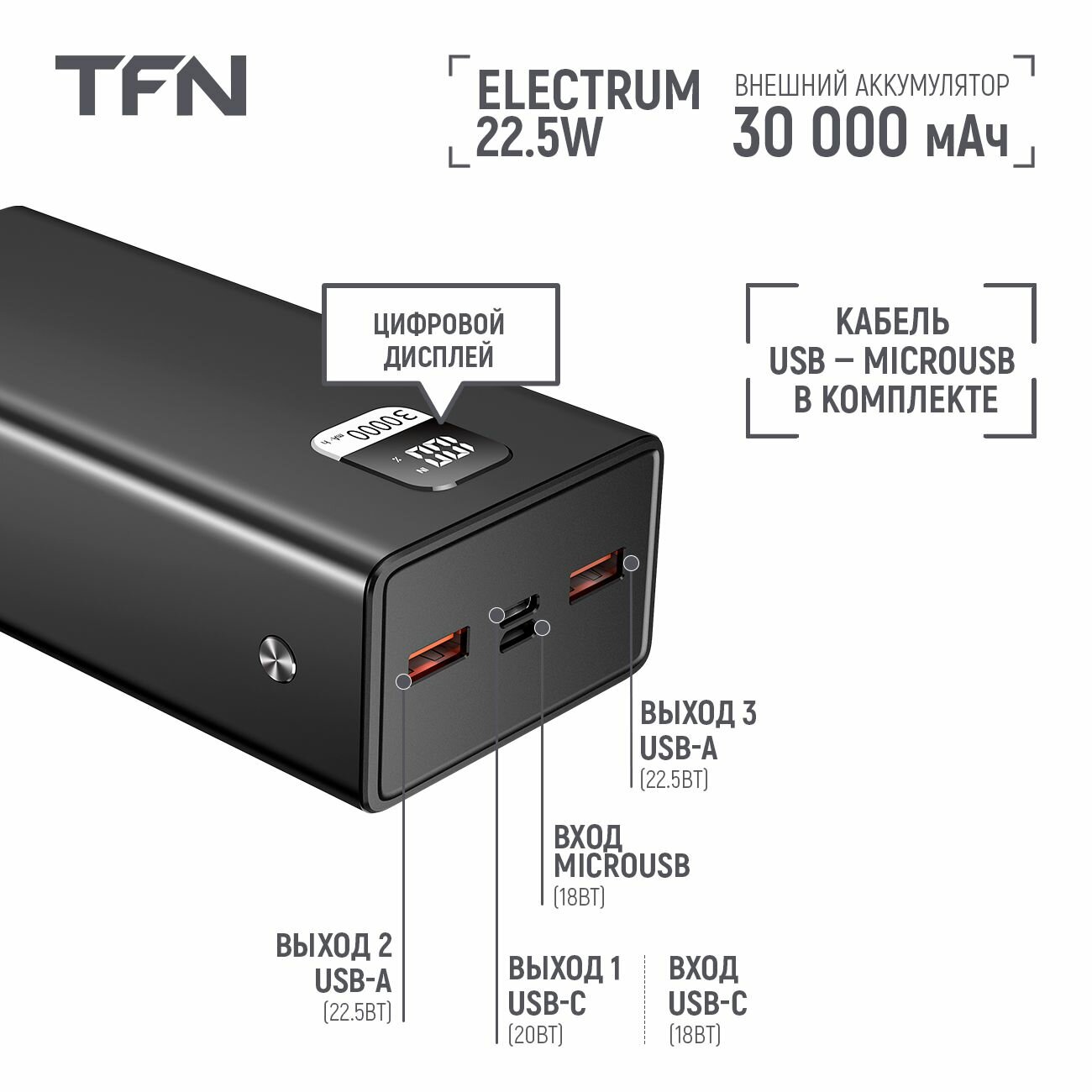 Внешний аккумулятор TFN Electrum 30000mAh Black (TFN-PB-296-BK) интересное: