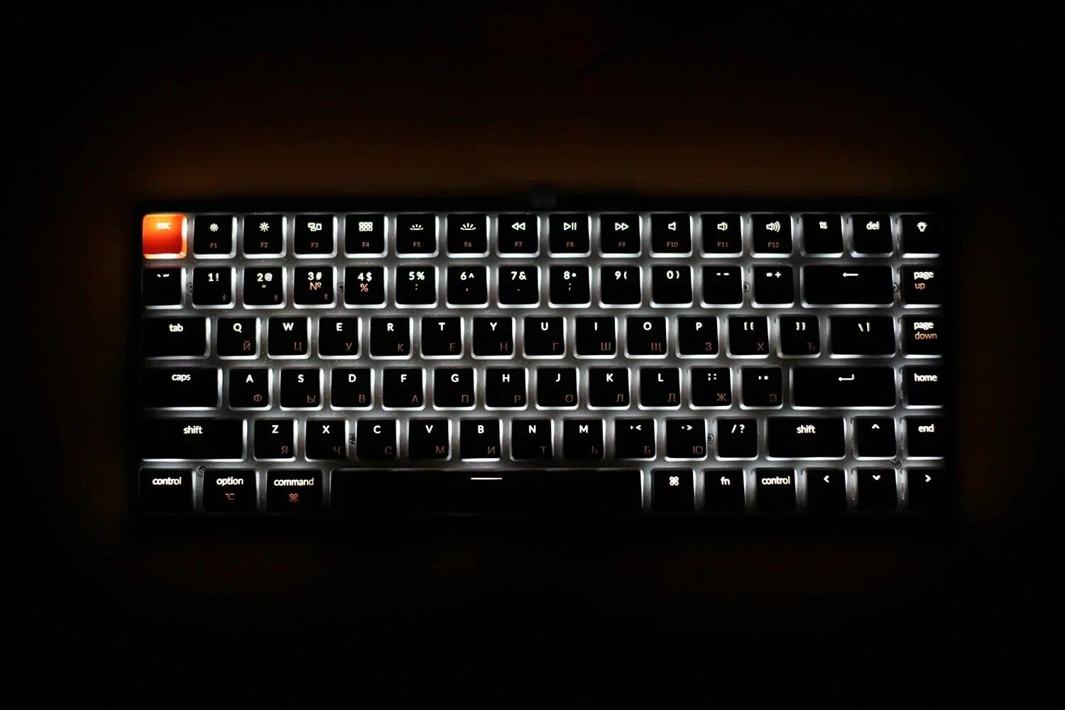 Русские буквы почти не подсвечиваются, но это уже особенности строения свитчей. В темноте их видно, и хорошо. |