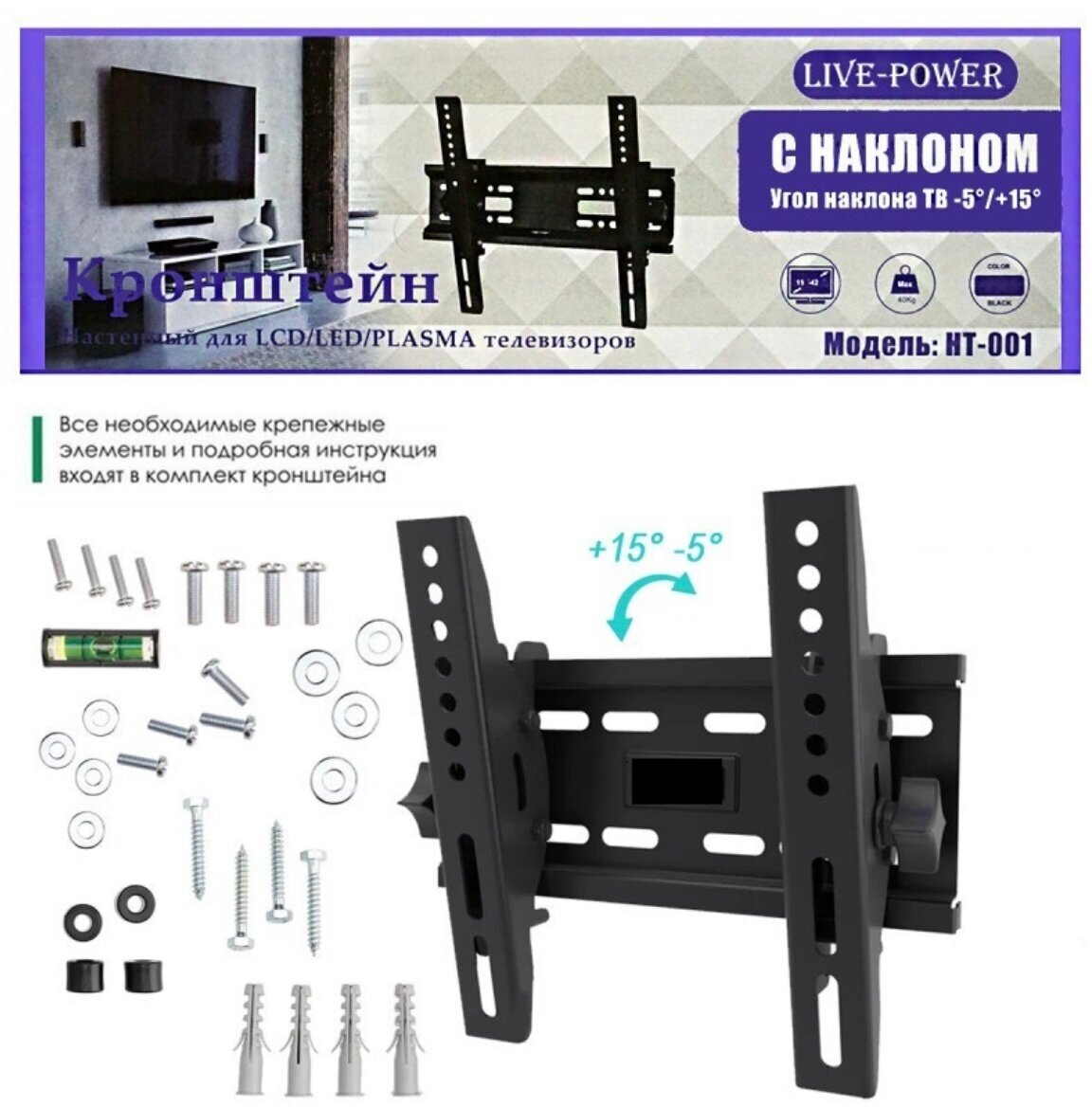 Ниже Вы можете прочитать отзывы на Кронштейн наклонный для ТВ Live-Power HT-001 (15"/42") (Черный), ознакомится с подробными характеристиками, посмотреть интересные обзоры и фотографии на Кронштейн наклонный для ТВ Live-Power HT-001 (15"/42") (Черный).