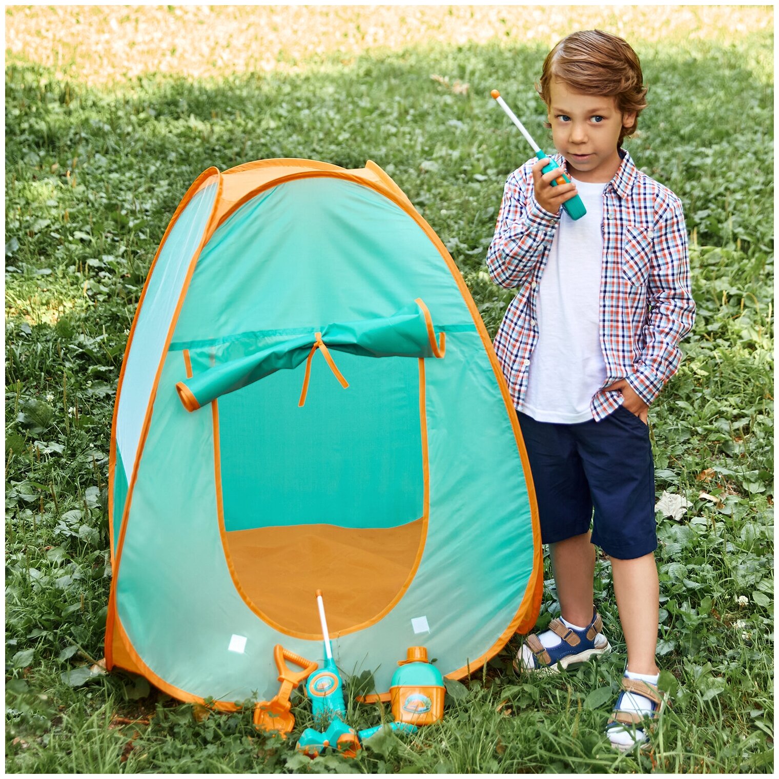 Детская игровая палатка "Набор Туриста" с набором для пикника 6 предметов: фляга, лопатка, бинокль, рации 2 шт., мультиприбор (свисток, фонарик, компа