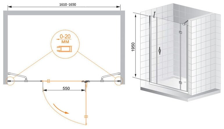 | Дополнительная информация | Ширина. мм | 1610;Материал полотна двери | стекло;Материал профиля | алюминий;Монтаж | на поддон/напольный;Поверхность | глянцевая;Дополнительная информация | дверь имеет регулируемую ширину на 4 см; |