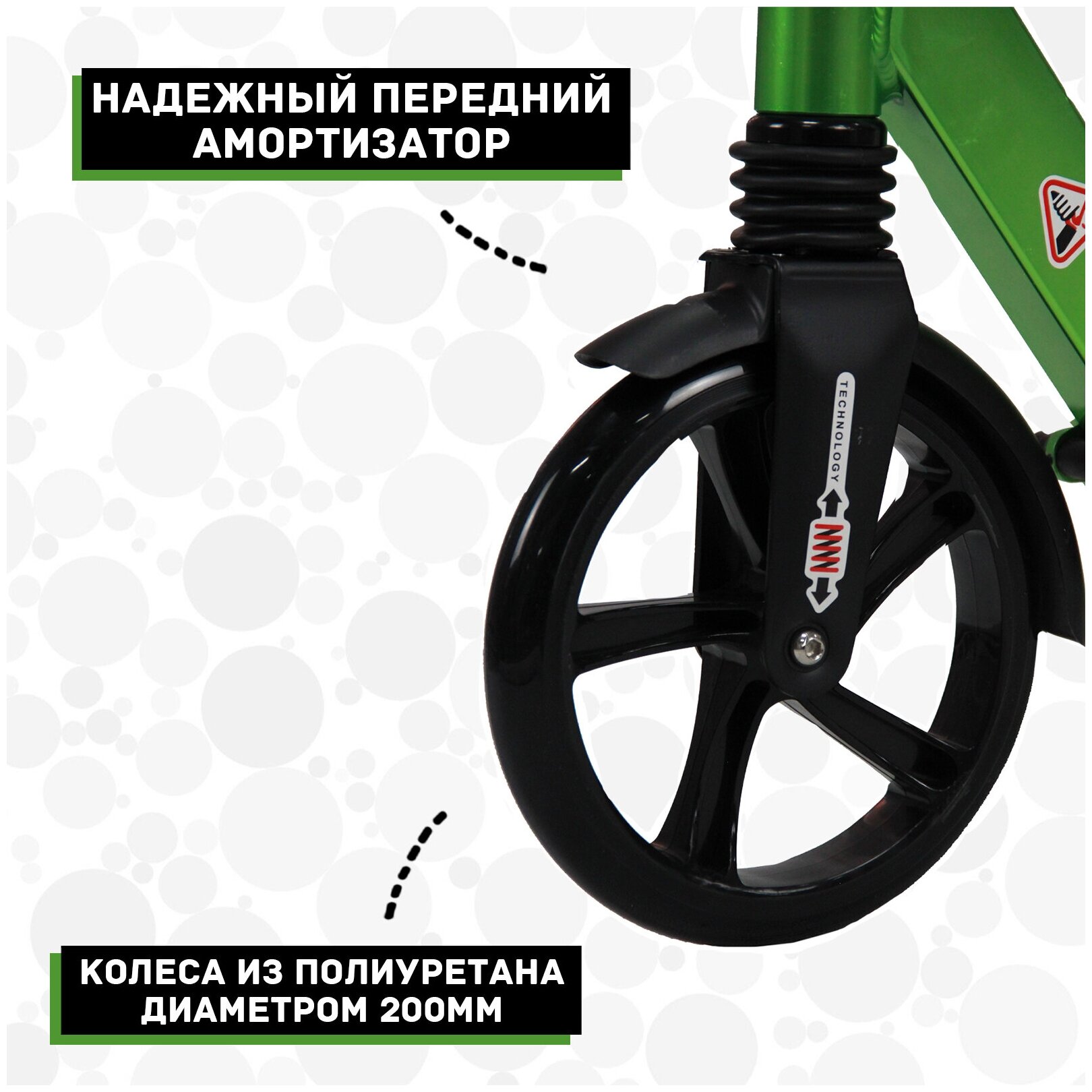 Самокат двухколесный, алюминиевый, колеса 200мм, складной, два амортизатора, ремень, подножка, зеленый интересное: