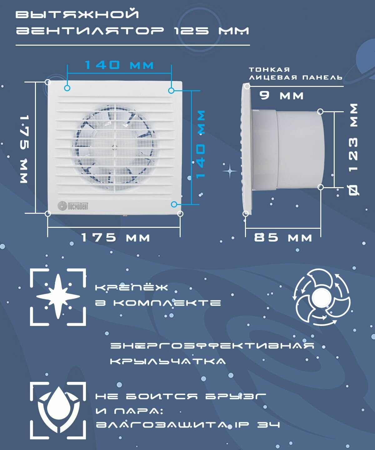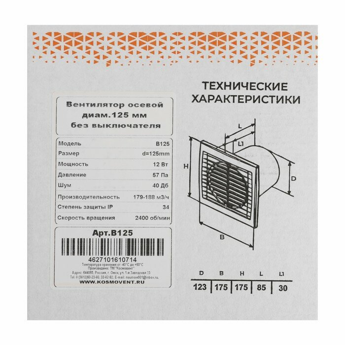 КосмоВент Вентилятор вытяжной "КосмоВент" В125, d=125 мм, 12 Вт, 40 дБ, 188 м³/ч, без выключателя
