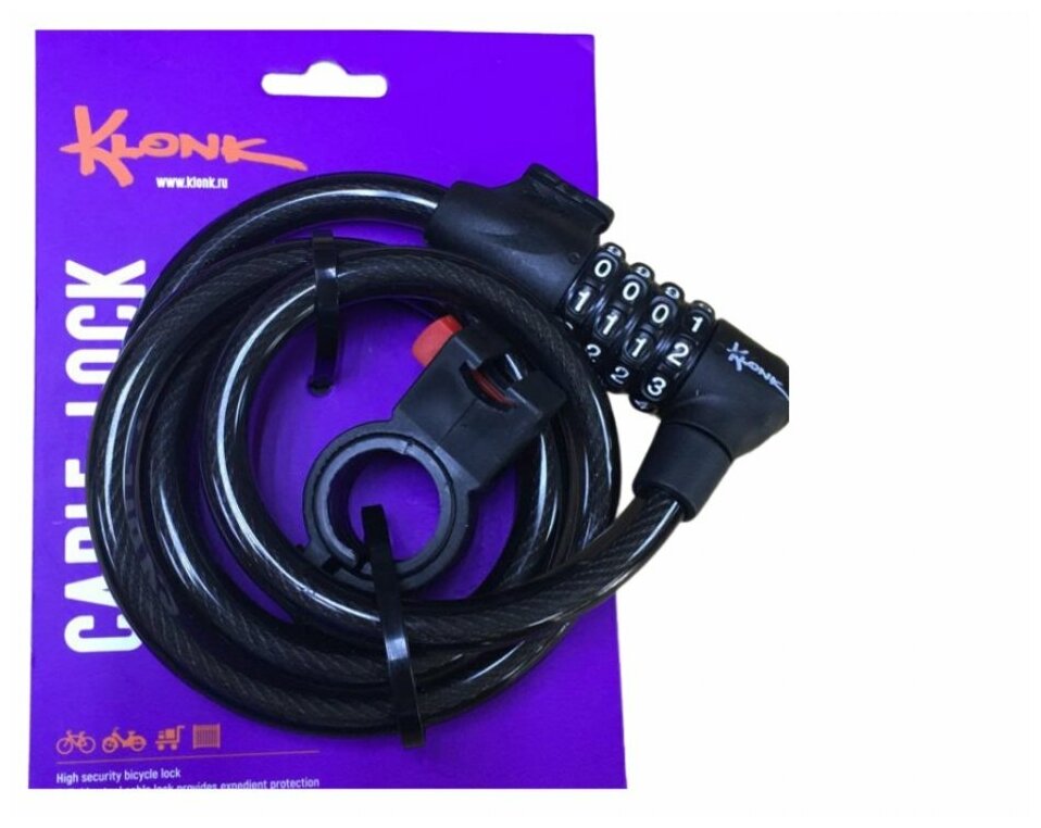 Замок противоугонный KLONK для велосипедов и самокатов кодовый 120 см, трос 12 мм, черный 10332