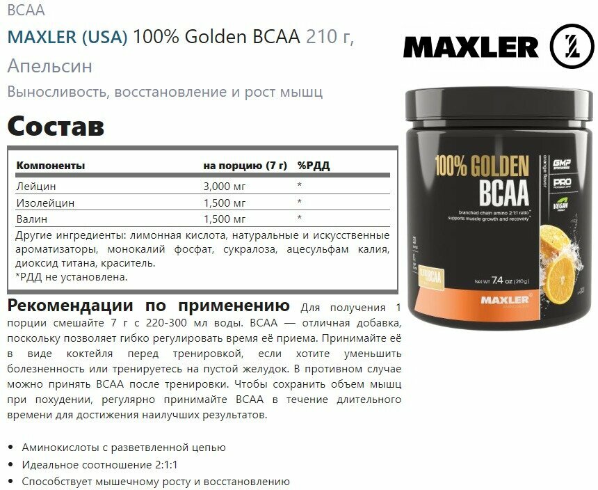 Ниже Вы можете прочитать отзывы на Maxler Аминокислоты БЦАА 100% Golden BCAA "Апельсин" (210 гр), ознакомится с подробными характеристиками, посмотреть интересные обзоры и фотографии на Maxler Аминокислоты БЦАА 100% Golden BCAA "Апельсин" (210 гр).