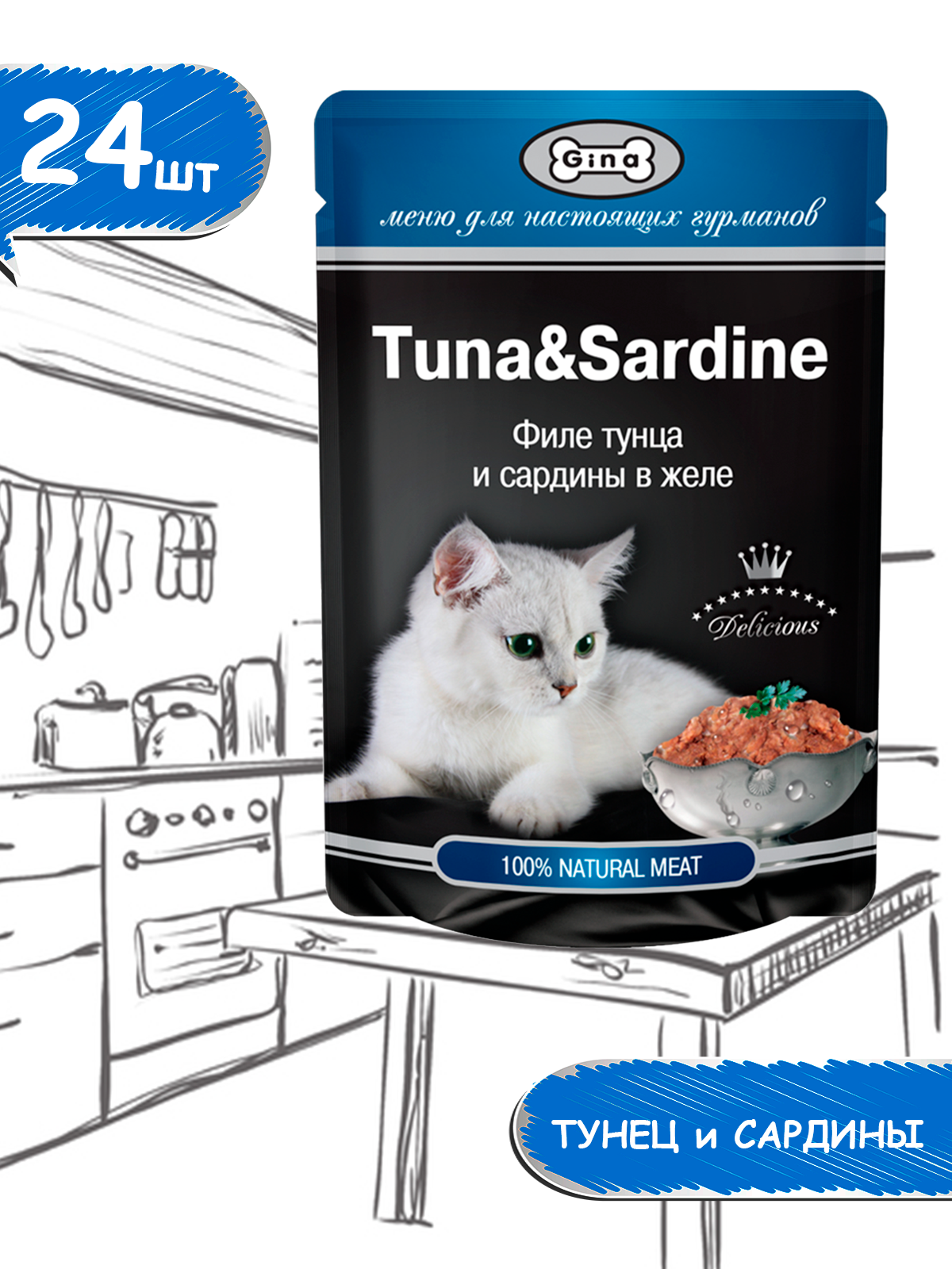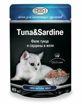 Купить Корм для кошек консервированный Gina Tuna & Sardine, тунец с сардинами в желе, пауч 85 г (24 шт.)