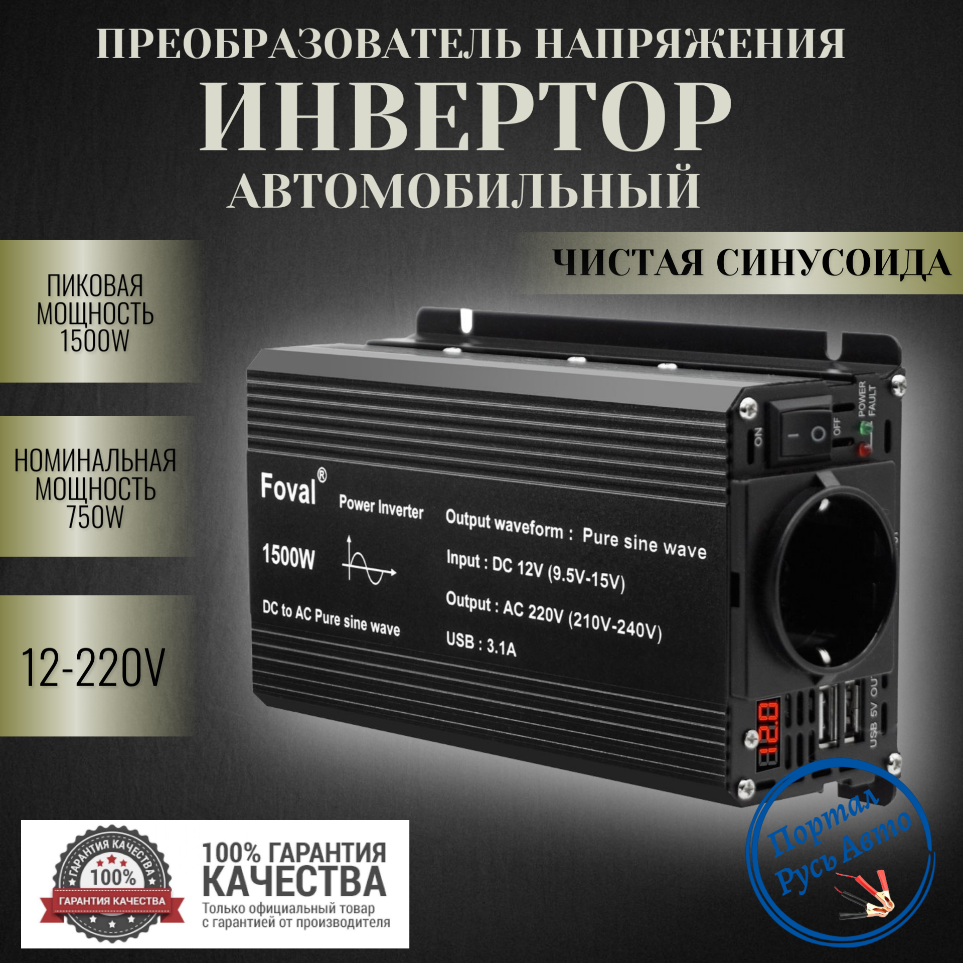 Автомобильный преобразователь напряжения инвертор FOVAL 1500 w 12v-220v Power inverter. Чистая, немодифицированная синусоида.