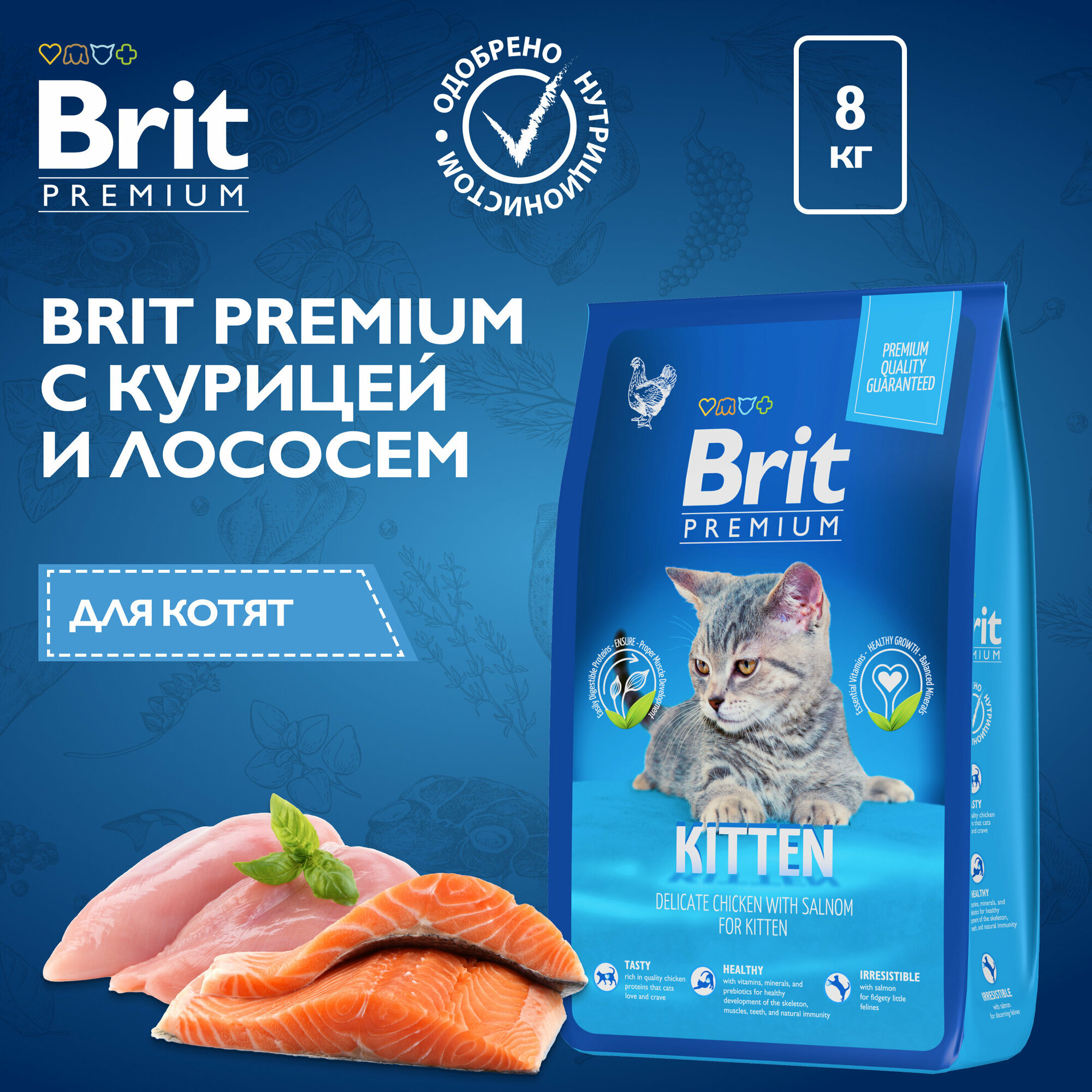 BRIT PREMIUM, Сухой корм с курицей и лососем для котят "Cat Kitten", 8кг