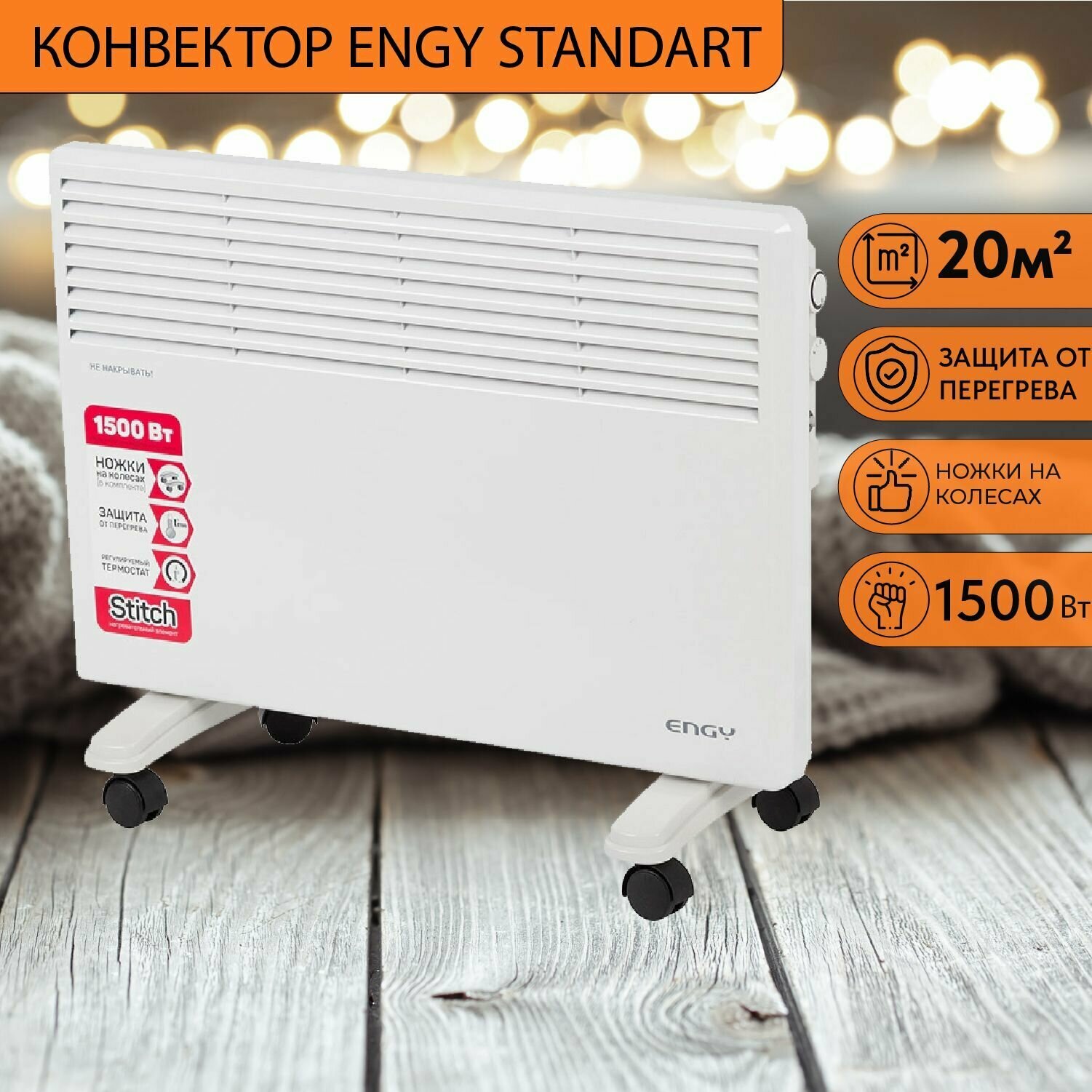Обогреватель EN-1500 Standard, конвекторный, 1500 Вт, 20 ?2, Stitch, белый