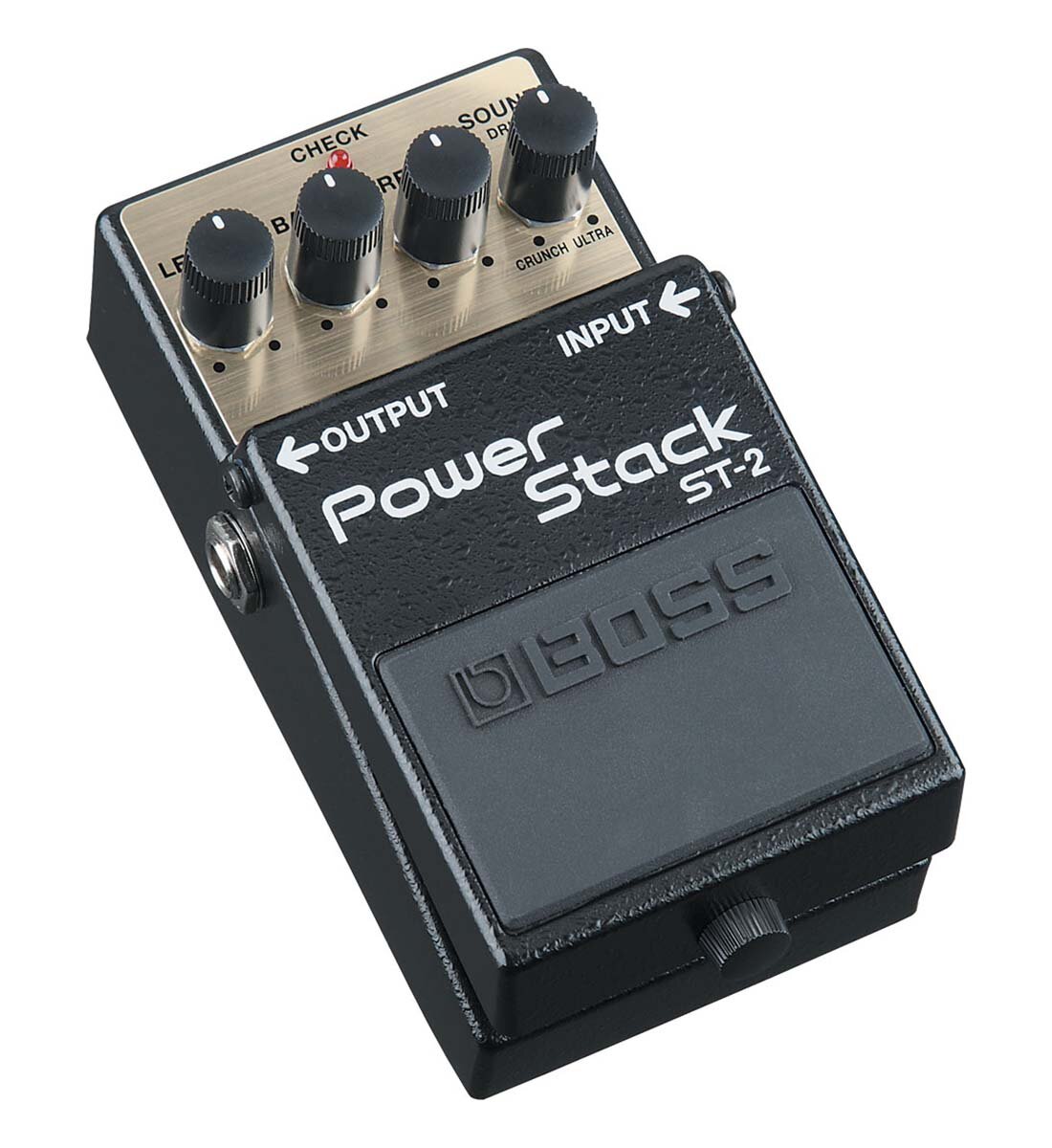 BOSS ST-2 гитарная педаль Power Stack. Регуляторы: Level, EQ и Sound. Индикатор Check. Разъемы: вход/выход (гнезда Jack), гнездо для адаптера 9V. Мета