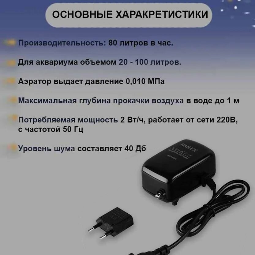 | Подробная комплектация | Компрессор для аквариума - 1 шт.; Распылитель - 1 шт.; Шланг 2 м - 1 шт.; Переходник на евро вилку - 1шт. |